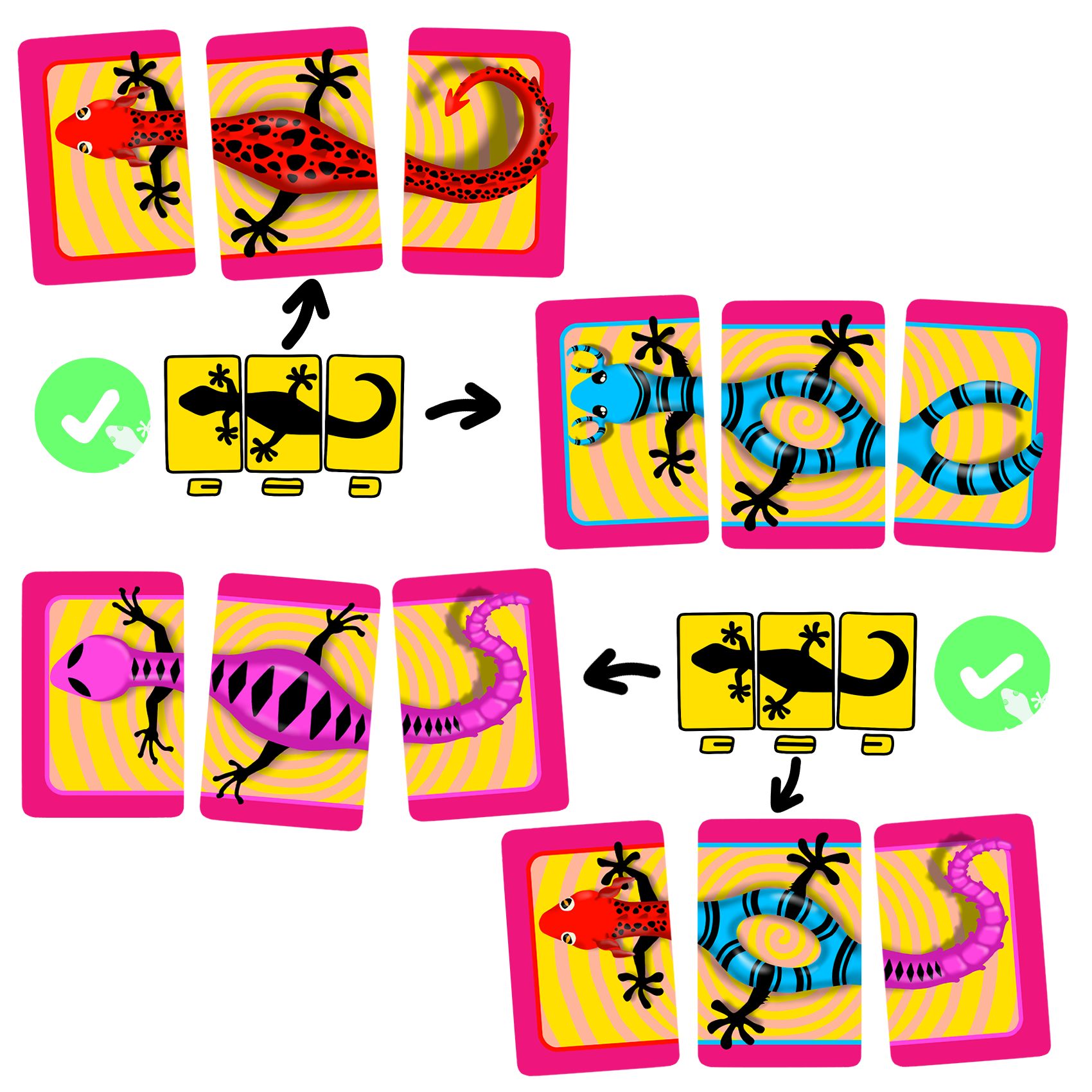 1. Schud alle kaarten, leg 1 willekeurige hoofd-, lichaam-, en staart kaart op de tafel, dit is de begin Dizzy Lizzy.
